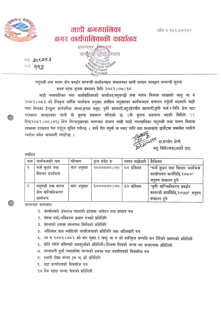 माडी नगरपालिकाको पशुपछी तथा मत्स्य विकास शाखा अन्तरगत पशुपछी तथा मत्स्य क्षेत्र प्रबर्धन सम्बन्धी कार्यक्रमहरु सञ्चालनका लागि प्रस्ताव आव्हान सम्बन्धी सूचना
