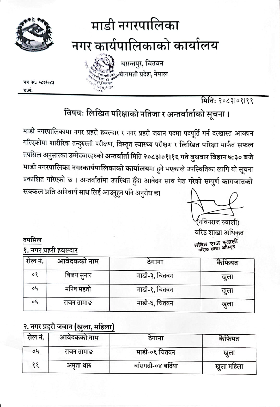 नगर प्रहरी लिखित परीक्षाको नतिजा र अन्तरवार्ताको सूचना