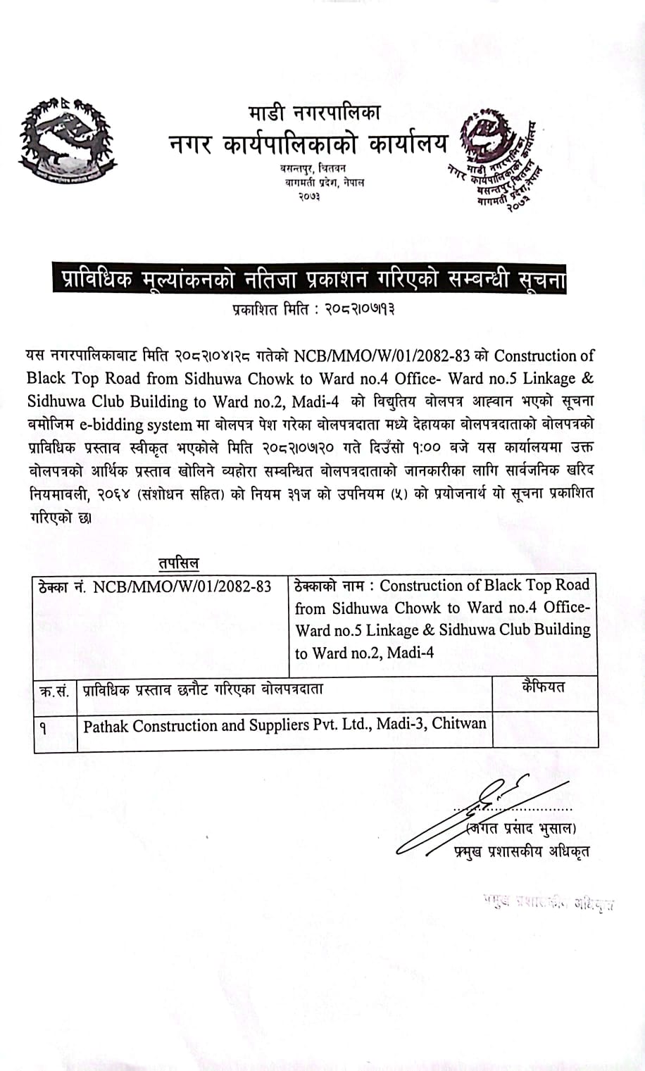 बोलपत्र स्विकृत गर्ने आसयको सूचना ।