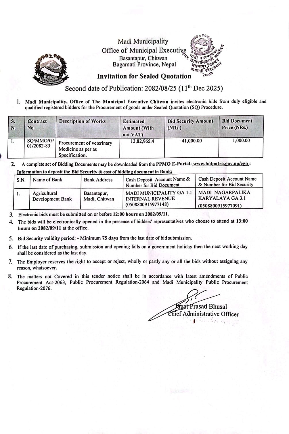 भेटेरिनरी औषधी खरिदको दोस्रो पटक सिलबन्दी दरभाउ पत्र पेश गर्ने सूचना