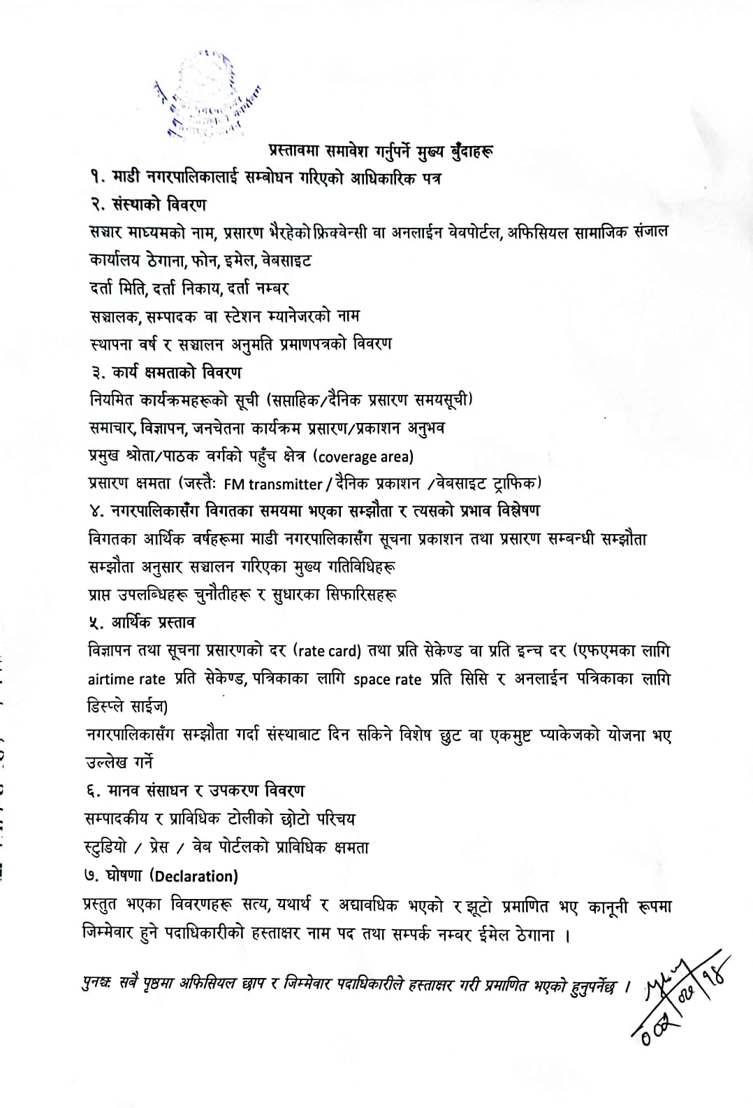 माडी भित्रबाट सञ्चालनमा रहेका स्थानीय एफ्.एम्. रेडियो, अनलाईन न्यूज पोर्टल तथा छापा पत्रिकाहरुमा सूचना प्रकाशन तथा प्रसारणका लागि प्रस्ताव आव्हान सम्बन्धी सूचना