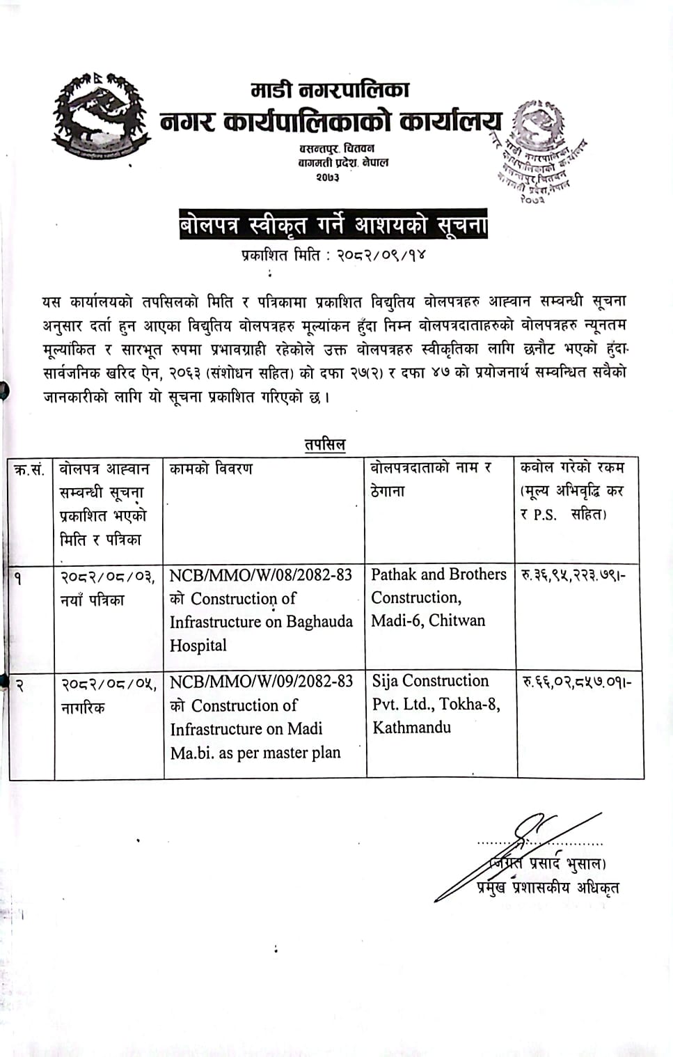 बोलपत्र स्विकृत गर्ने आसयको सूचना ।