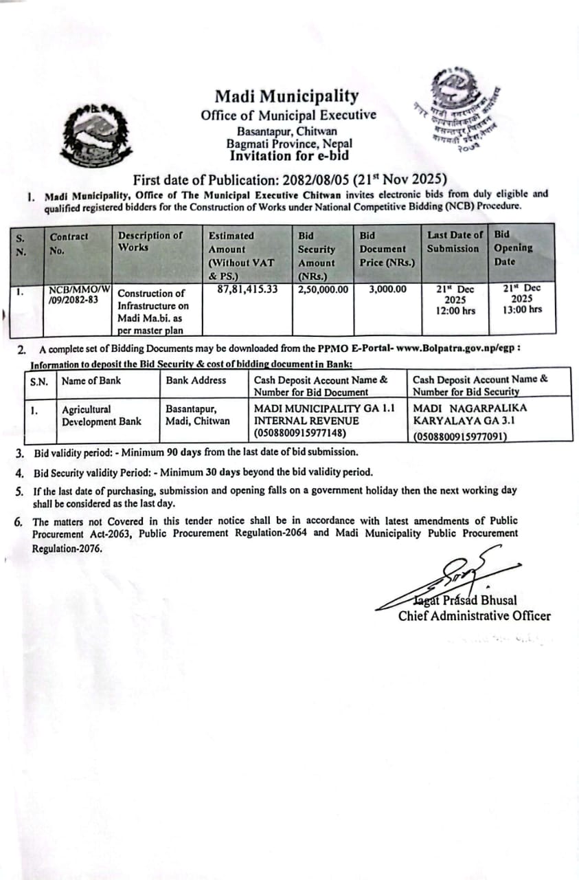 माडी मा.वि.मा पूर्वाधार निर्माण सम्बन्धी बोलपत्र आव्हानको सूचना